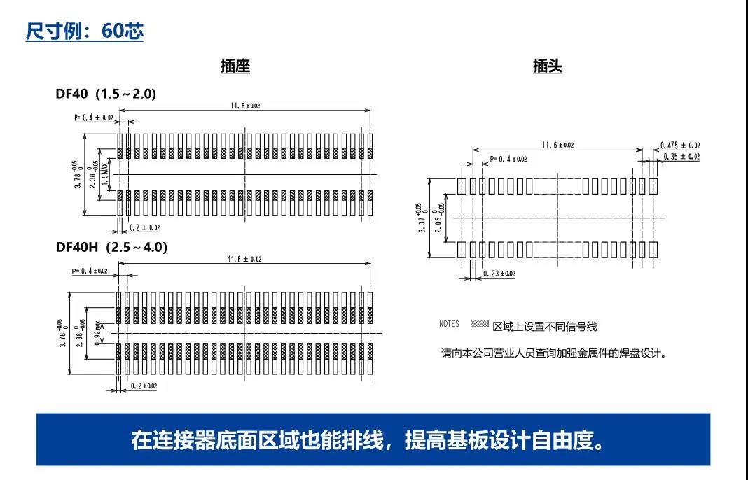 特点 1. 省空间:纵深3.38mm 2. 堆叠高度 1.5-4.0mm 3. 对应USB4 Gen.2(10Gbps)信号传输 *1 4. 有效嵌合长度长:0.45mm 5. 卓越的端子构造实现了明确的锁扣手感以及大嵌合力 6. 防止端子变形构造 7. 种类繁多(带护罩:DF40G系列,带完全锁:DF40GL系列,ADAS:DF40T系列) 8.核心数量从10到120核心变化巨大 9.用导向肋确保自动对准:0.33mm 10.防止镍阻挡层焊接的结构 11.还提供用于生产线检查的高度耐用的连接器* 只有H=1.5 mm的产品支持Type-C DF40系列变体