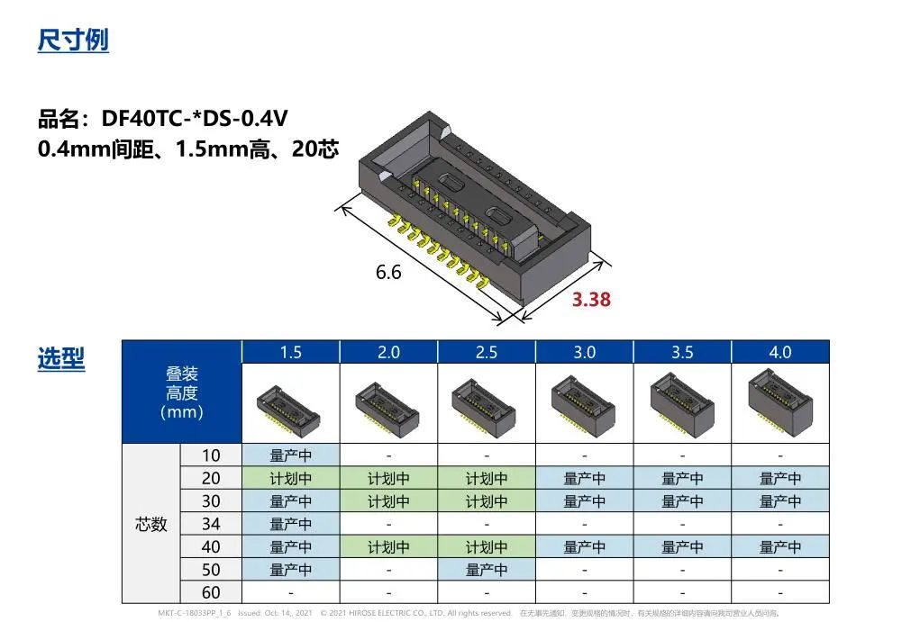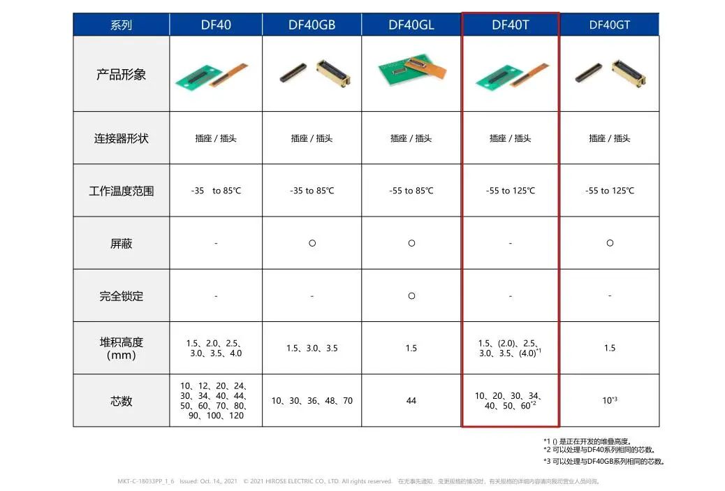 01 DF40系列 选型✦ 02 尺寸&选型 ✦ 03 车载应用使用事例 ✦ 04 连接示意图 ✦ 05 支持PCI Express 4.0 (16Gbps) 传输 ✦ 06 检查用连接器 ✦ 07 推荐基板图案 ✦ 08 规格 ✦ 如果应用需要高度可靠性,例如汽车,请联系公司代表以获取更多信息。